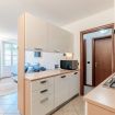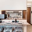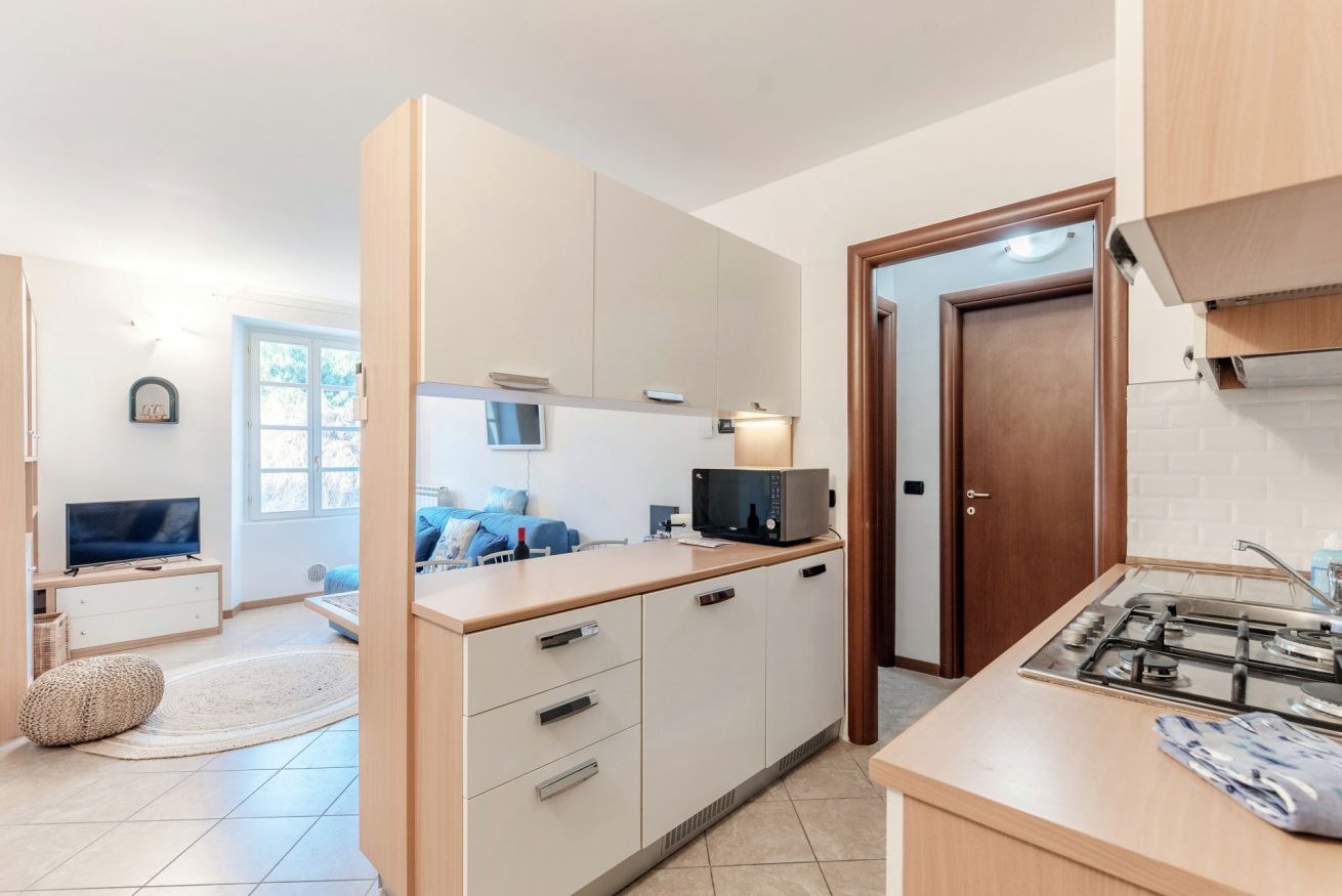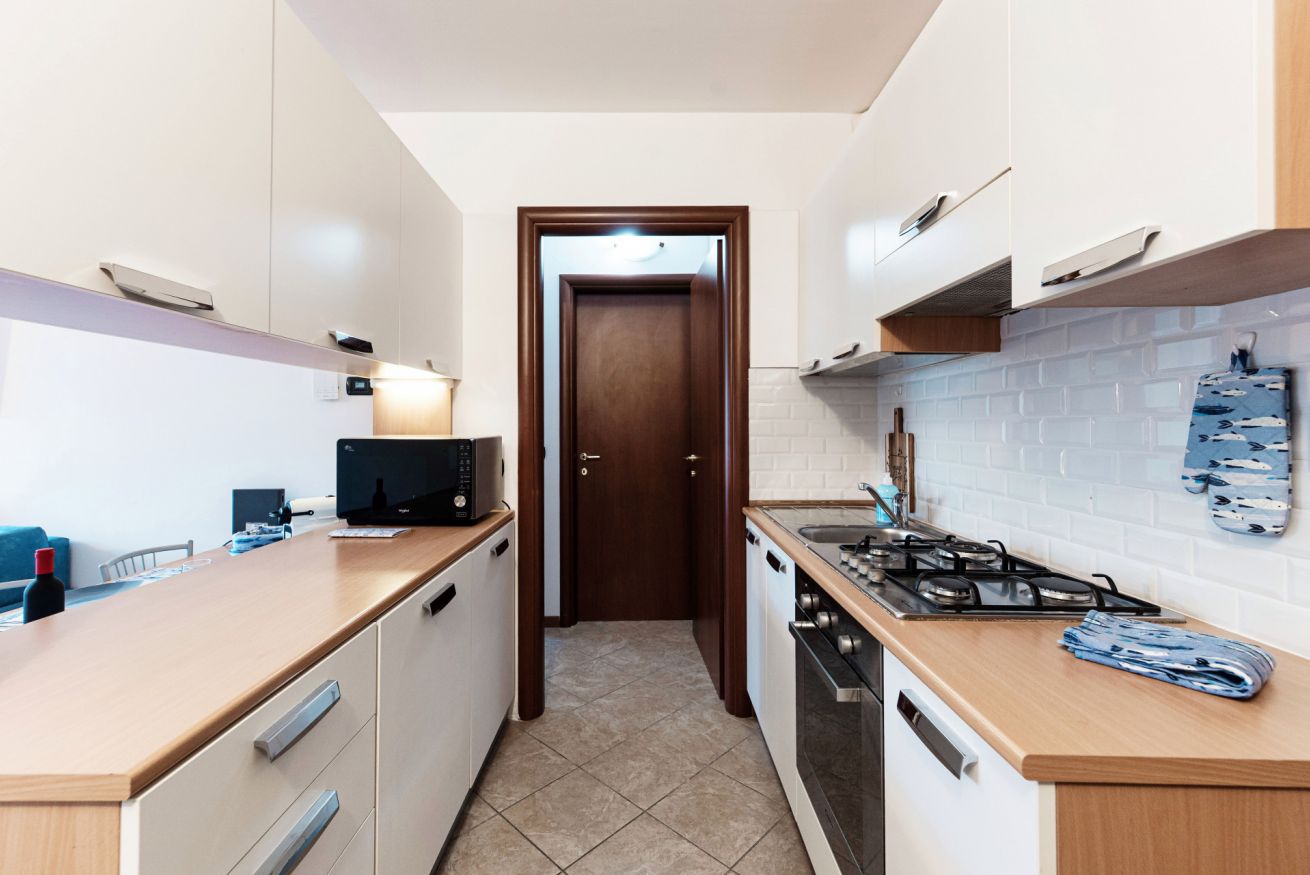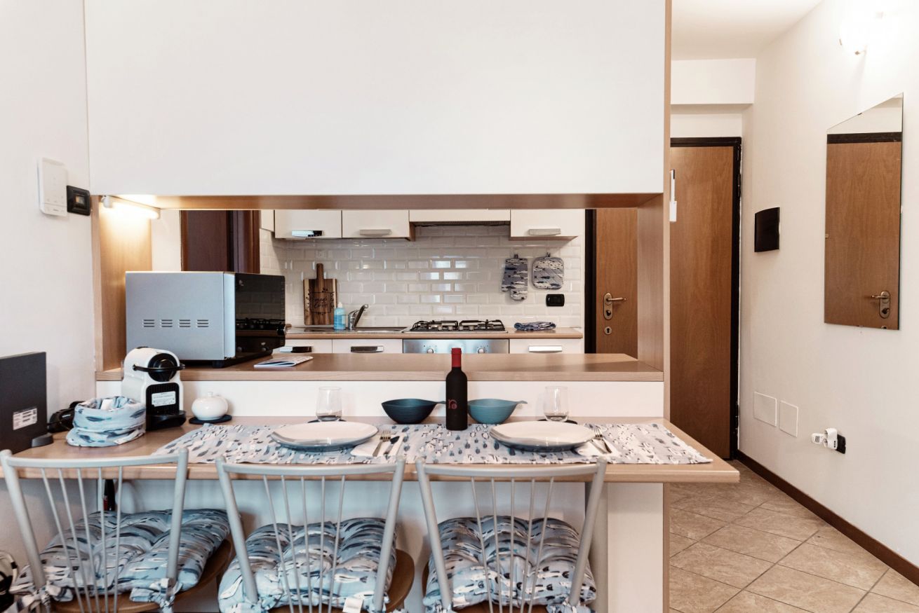 Cucina a vista completamente attrezzata, fornita di angolo cottura, macchina del caffè e stoviglie.