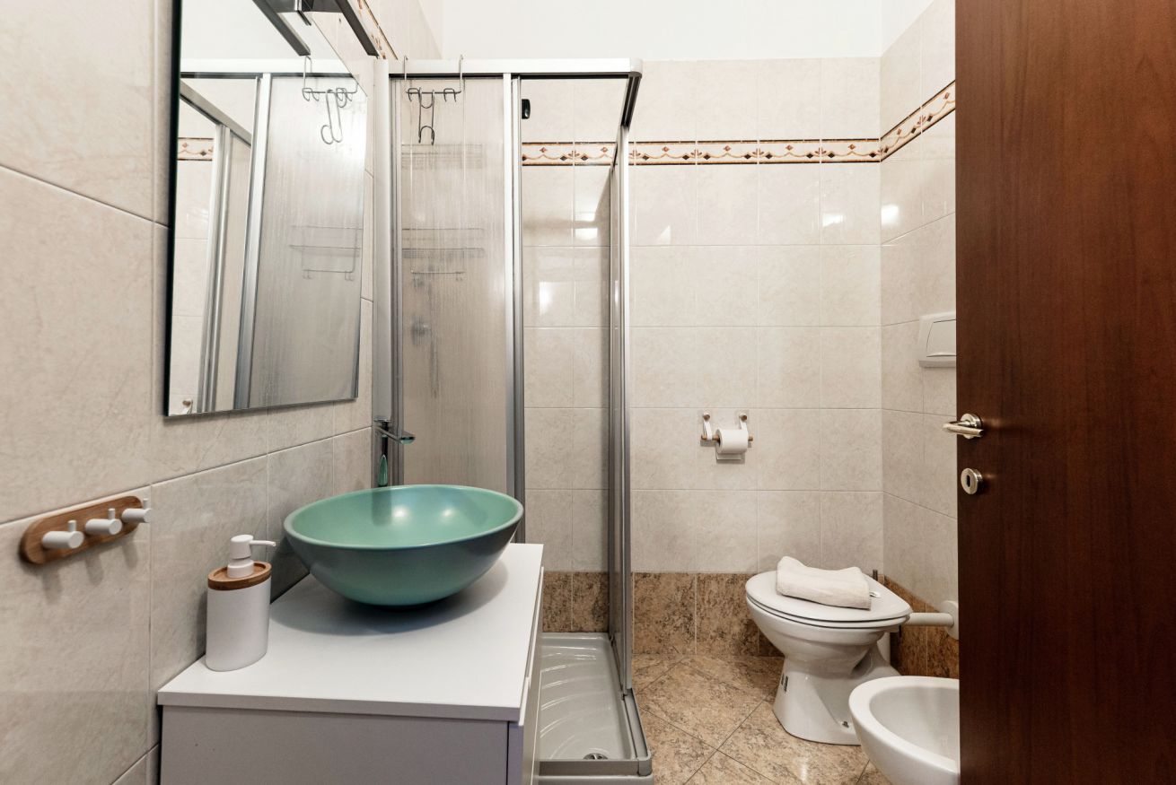 Un bagno moderno e funzionale, dotato di box doccia, set di cortesia e asciugamani freschi.